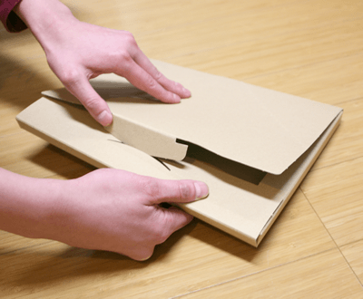 書類やパンフレットの郵送にはメール便を使うことが多いものですが、書類の郵送にぴったりのA4サイズやB5サイズといったメール便用の梱包材もあるんですよ。 この『現場のチカラ メール便対応箱』は一度組み立てると解体できない仕組みになっていて、メール便を受け取った方は、ふたにあるミシン目からペリッと包装をはがすことができます。 いちいちカッターやはさみで開封しなくてもいいから、お客さまに喜ばれる仕様です。